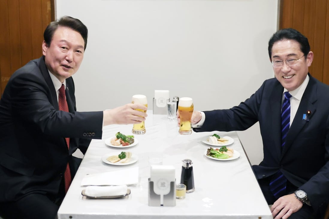 South Korean President Yoon Suk-yeol (left) and Japanese Prime Minister Fumio Kishida toast during dinner at a Tokyo restaurant in March. Photo: dpa