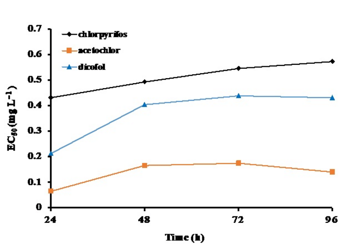 This study provides new insights into the toxicity of three pesticides to marine microalgae as well as the evidence concerning the contribution of microalgae in the removal of these pesticides from the environment. The molecular processes and mechanisms of degradation of pesticides by marine microalgae will to be further investigated.