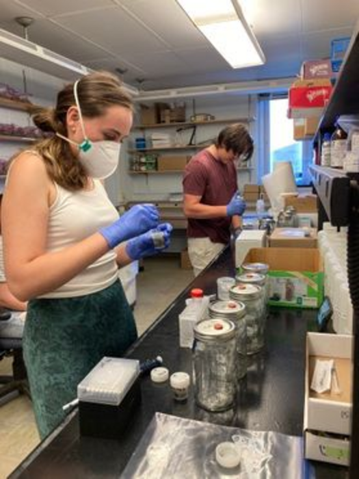 WVU students Joanna Ridgeway and Dominick Cifelli measure carbon dioxide respiration from soil incubations to get an indicator of microbial activity.