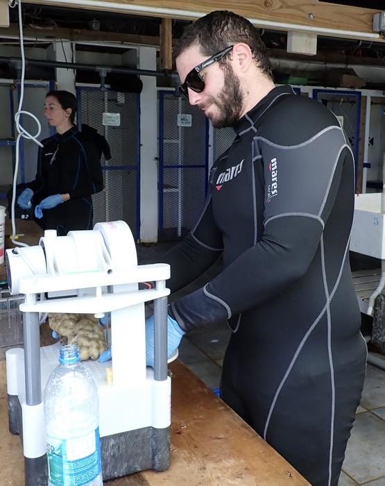 Rice University graduate student Alex Veglia samples a coral for a study by researchers at Rice and Oregon State that found fragments of non-retroviruses in the genomes of coral symbionts. Rice marine biologist Adrienne Correa is in the background.
