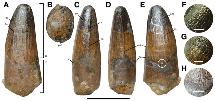 (A) Lingual, (B) basal, (C) mesial, (D) distal and (E) labial view. (F–G) Close up of the enamel texture on the labial tooth surface. Abbreviations: ca, carina; ce, cervix; co, crown; ent, enamel texture; flu, flute; puc, pulp cavity (infilled); ro, root. Scale bars (A–E): 10 mm, (F–G): 1 mm.