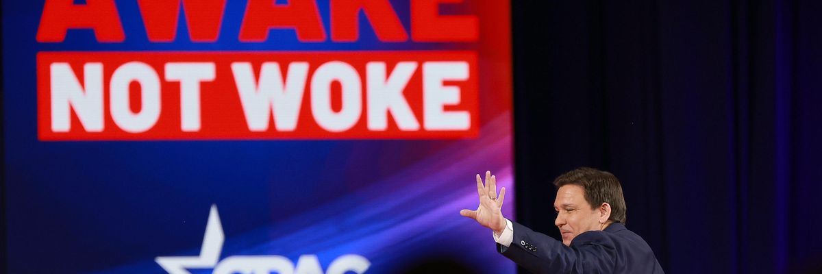 Republican Florida Gov. Ron DeSantis takes the stage in front of a sign reading "Awake Not Woke" at the Conservative Political Action Conference (CPAC) on February 24, 2022 in Orlando, Florida