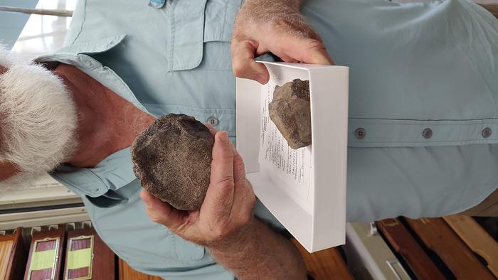 Steve May, a research associate at the Jackson School of Geosciences, holds a fossil from a plesiosaur, an extinct marine reptile. The fossil is among the first Jurassic vertebrate fossils discovered and described in Texas.
