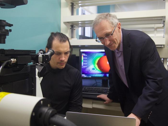 IMAGE: PENN STATE BIOMEDICAL ENGINEERING GRADUATE STUDENT LEONARDO DOMINGUEZ RUBIO, LEFT, AND PENN STATE DOROTHY FOEHR HUCK AND J. LLOYD HUCK CHAIR PROFESSOR OF BIOMEDICAL ENGINEERING IGOR ARONSON ARE PART OF A TEAM THAT USED ULTRASOUND TECHNOLOGY AND A NOZZLE TO SEPARATE, CONTROL AND EJECT DIFFERENT PARTICLES BASED ON THEIR SHAPE AND VARIOUS PROPERTIES. view more