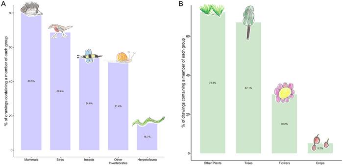 The children were most specific when drawing mammals and birds, with most of these animals being an identifiable species. Among animals, insects, reptiles, amphibians and other invertebrates were less often identifiable to species. Among plants, trees and crops—such as strawberries, potatoes, and carrots—were most identifiable.