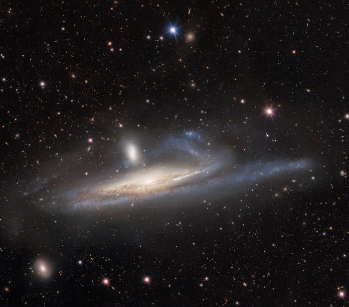 Despite its small stature, however, the dwarf galaxy has also been exerting a noticeable gravitational influence on its larger companion, distorting one of its spiral arms, which can be seen rising above the galactic plane. Additionally, plumes of gas and dust can be seen between the two galaxies, like a bridge of stellar matter held in place by the competing tidal forces. This interaction has also triggered bursts of star formation within both galaxies.