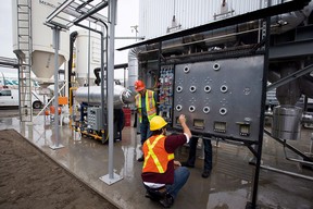 Workers calibrate equipment at Carbon Engineering Ltd.’s direct air capture plant in Squamish, B.C. The Canadian company was recently bought by Warren Buffett-backed oil producer Occidental Petroleum Corp.