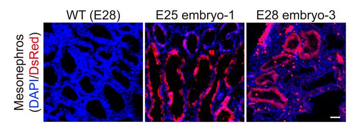 IMAGE: THIS FIGURE SHOWS HUMANIZED KIDNEY CELLS (RED FLUORESCENCE) INSIDE THE EMBRYO COMPARED TO A "WILDTYPE" PIG EMBRYO. view more