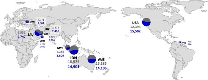 Optimization results for importing ammonia from the top ten exporting countries (Scenario 3); The circle size represents the amount of imported ammonia and the color represents the ratio of carbon-based to carbon–neutral ammonia (gray indicates carbon-based ammonia and blue indicates carbon–neutral ammonia). (For interpretation of the references to color in this figure legend, the reader is referred to the web version of this article.)