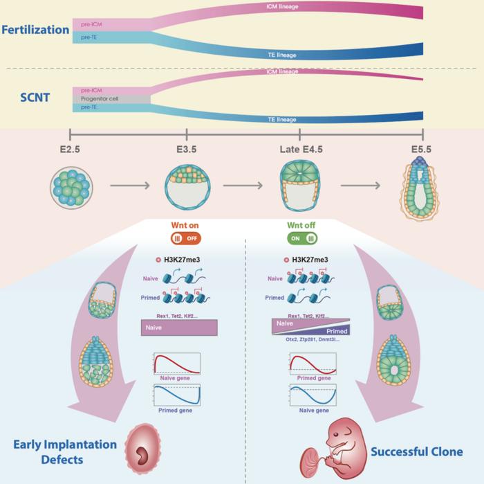 Recently, a team from China led by Dr. Shaorong Gao have used an improved 3D in-vitro embryonic culture system to permit the visualization of the peri-implantation development of SCNT embryos and observed an abnormal morphogenetic step and pluripotency state in epiblast structure during the transition from blastocyst to egg cylinder. By conducting in-depth experiments and analysis, they characterized a new epigenetic mediated barriers-persistent Wnt signaling activity that can prevent the peri-implantation development of SCNT. Importantly, they presented a rescue approach that can attenuate the pluripotency transition and abnormal epigenetic remodeling and further improve cloning efficiency.