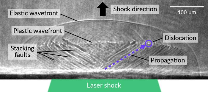 This X-ray radiographic image – similar to a medical X-ray, but taken at ultrafast speed with an X-ray laser – shows shock waves traveling through a diamond crystal. The initial wave is elastic. The plastic wave follows, creating defects in the material called dislocations that propagate through the material faster than the speed of sound. The arrow shows the path and direction of one dislocation, which has left a linear defect called a stacking fault in its wake. The dislocation itself is seen at the tip of the arrow. Other stacking faults can be seen fanning out from the site of the laser shock.