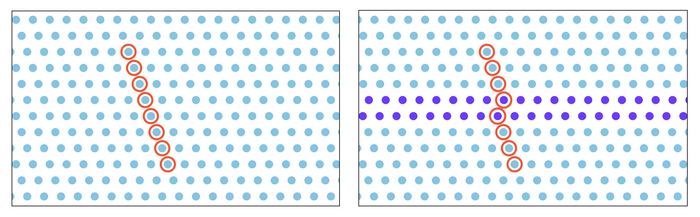 A shock wave traveling through a material can create defects known as dislocations – tiny shifts in the material’s crystal that propagate through it, leaving what are known as stacking faults behind. At left, the regular arrangement of the material’s atoms is undisturbed. At right, dislocations have traveled from left to right through the material, creating a stacking fault (purple) where adjacent layers of the crystal don’t line up quite the way they should.