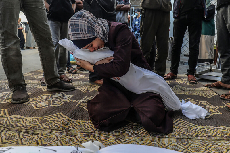 A woman cries while holding the body of her sister who was killed in an Israeli airstrike, al-Najjar hospital, Rafah, southern Gaza, 21 October. Abed Rahim KhatibDPA