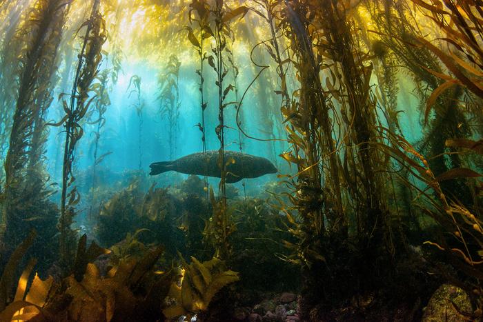 A seal swims through a giant kelp forest in Baja California earlier this summer.