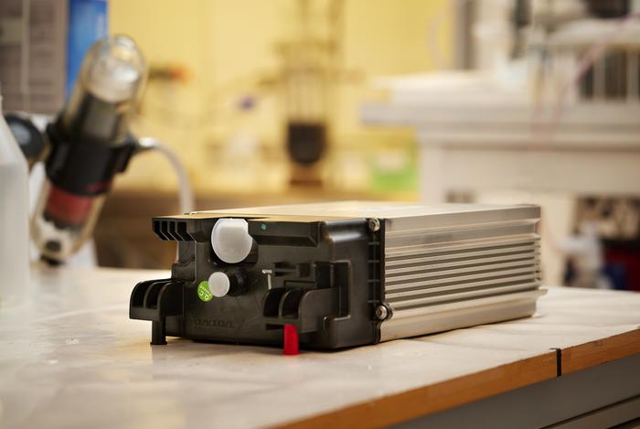 The researchers at Chalmers work with real spent car batteries from Volvo Cars. Here is a battery module, holding 14 battery cells.