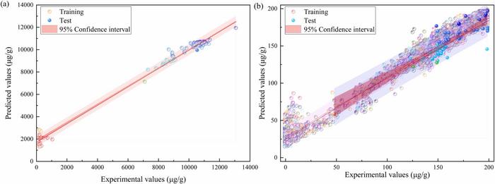 Comparison of the GBDT-reg predicted and experimental qe values for (a) Ptotal and (b) individual PPCP
