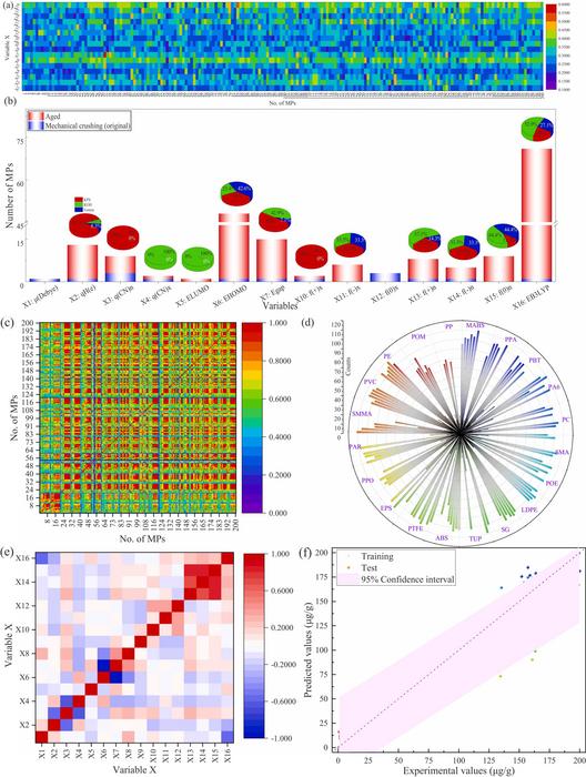 (a) MIC values between variable X (quantum chemistry parameters) and Y (MPs); (b) MIC statistical analysis of the long-term aged MPs; (c) MIC values between any two MPs; (d) a total number of MIC values are over 0.8000; (e) the correlation coefficient between variable X; and (f) comparison of the GBDT-reg predicted and experimental qe values