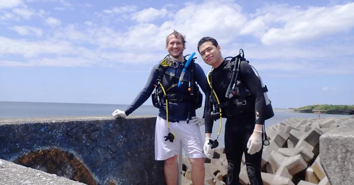 Kevin Wakeman (left) and Siratee Riewluang (right) collecting samples in Okinawa, Japan. (Photos: Kevin Wakeman and Siratee Riewluang)