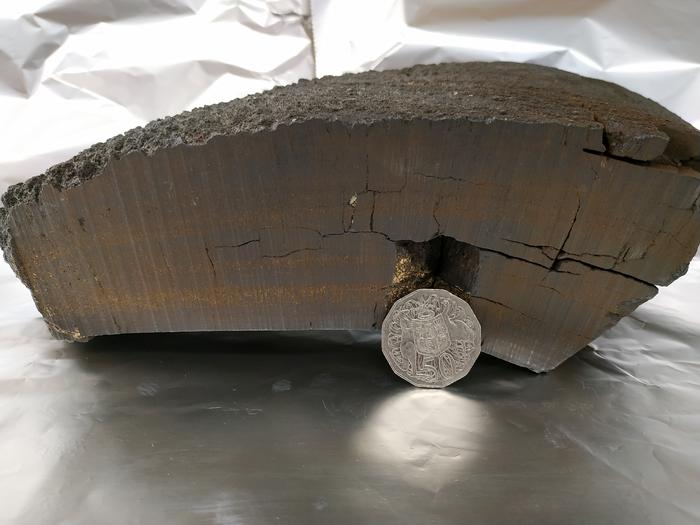 Accelerator mass spectrometry (AMS) measurements of this ferromanganese crust from the Pacific Ocean have revealed interstellar iron-60, manganese-53, and plutonium-244. Included are atoms dating back more than 20 million years. The coin as a scale has a diameter of 3.2 cm.