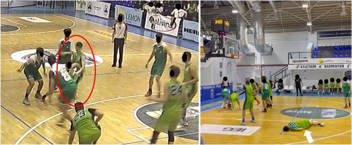 INITIALLY, THERE IS A SCRAMBLE FOR A LOOSE BALL AND PLAYER M.V. (LARGE WHITE ARROW) IS STRUCK IN THE CHEST BY THE ELBOW OF AN OPPONENT. M.V. STUMBLES BUT REMAINS UPRIGHT FOR A FEW SECONDS JUST PRIOR TO FULL COLLAPSE IN CARDIAC ARREST.