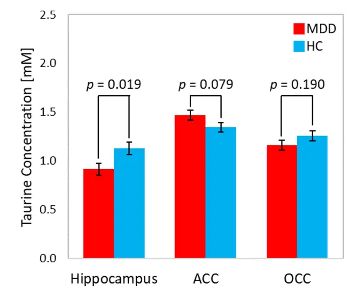 Taurine concentrations in the hippocampus, frontal cortex (anterior cingulate cortex, ACC) and occipital cortex (OCC) (red: depression patient group, blue: healthy control group). The average taurine concentration in the hippocampus is 0.91 mM for the depression patient group and 1.13 mM for the healthy control group.