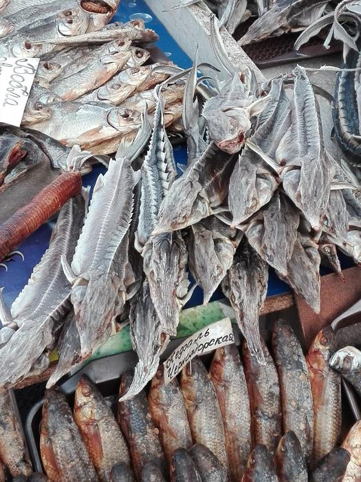 A PILE OF STURGEONS BEING SOLD AT A FISH MARKED IN EASTERN EUROPE.