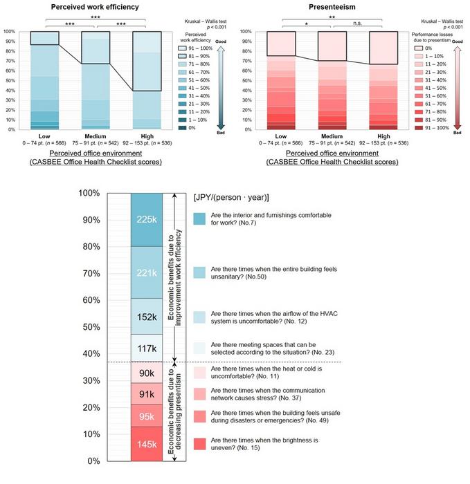 The effects of overall office environment elements on perceived work efficiency and presenteeism were examined in the study. A better overall office environment was associated with higher perceived work efficiency among workers. "Workers in offices with lower environmental performance had low work efficiency, while those in higher-performing offices had high work efficiency. The 16.8-point difference in work efficiency between workers in offices with relatively good and poor environments equates to an annual economic benefit of about 1,039,000 JPY, highlighting the financial advantages of a good work environment," explains Prof. Kawakubo. Similarly, a better overall office environment was linked to lower performance loss due to presenteeism. Prof. Kawakubo notes, "The better the office environment, the lower the amount of loss due to presenteeism. The difference in annual economic loss due to presenteeism between workers in offices with relatively low environmental performance and workers in offices with relatively high environmental performance was 423,000 JPY."