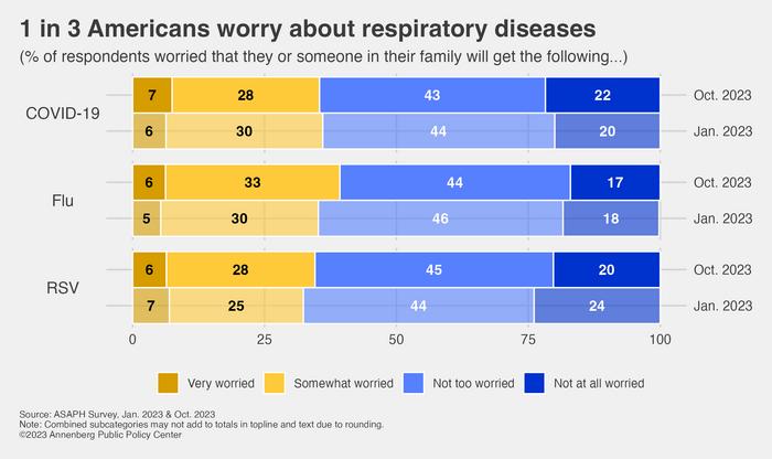 - RSV concern: 35% worry that they or someone in their family will get RSV in the next three months, up from 32% in January 2023. About two-thirds (65%) are not worried.