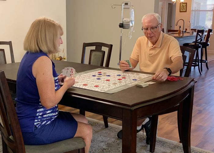 Mike Sail plays a board game with his wife, Ann, while hooked to an IV treatment as part of his seizure care plan. Hair standing up on his arms and a flushed feeling that starts in his abdomen were misdiagnosed as acid reflux until he underwent testing at the Orlando Health Neuroscience Institute to determine that, for him, these were symptoms of seizures.