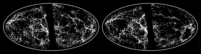 Distribution of the brightest galaxies in the Local Universe, observed in the 2MASS survey (left panel) and reproduced in the SIBELIUS simulation (right panel). Both panels show projections in supergalactic coordinates, out to approximately 100 Megaparsec (Mpc). The nearly vertical empty stripe represents the region of the sky hidden behind our own Milky Way galaxy. The simulation accurately reproduces the structures seen in the Local Universe.