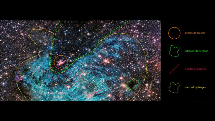 Webb’s NIRCam (Near-Infrared Camera) instrument also captured large-scale emission from ionized hydrogen surrounding the lower side of the dark cloud, shown cyan-colored in the image. Typically, Crowe says, this is the result of energetic photons being emitted by young massive stars, but the vast extent of the region shown by Webb is something of a surprise that bears further investigation. Another feature of the region that Crowe plans to examine further is the needle-like structures in the ionized hydrogen, which appear oriented chaotically in many directions.