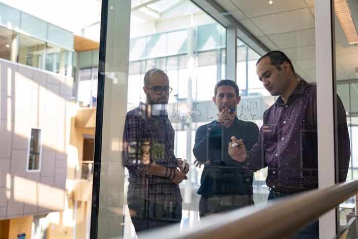 UBC OKANAGAN FACULTY OF MANAGEMENT RESEARCHERS DR. AMIR ARDESTANI-JAAFARI (RIGHT) AND DR. AMIN AHMADI DIGEHSARA DISCUSS THEIR GAMING STRATEGY THAT HELPS PROTECT INFRASTRUCTURE FROM ATTACK WITH STUDENT MOHAMMAD MOSAFFA (LEFT).