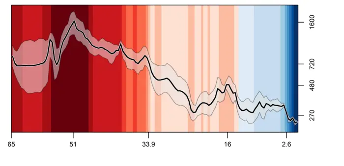 Temperatures and atmospheric concentrations of carbon dioxide over the past 66 million years. Bottom numbers indicate millions of years in the past; right-hand numbers, carbon dioxide in parts per million. Hotter colors indicate distinct periods of higher temperatures; deeper blues, lower ones. The solid zigzagging line charts contemporaneous carbon dioxide levels; shaded area around it reflects uncertainty in the curve.