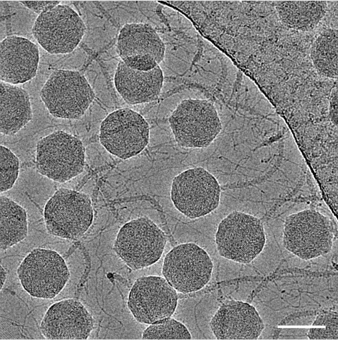 An electron micrograph — a photograph taken by means of a transmission electron microscope — of the DT57C bacteriophage. These types of images have been used to obtain a three-dimensional structure of the entire virus. Scale bar: 80 nanometers