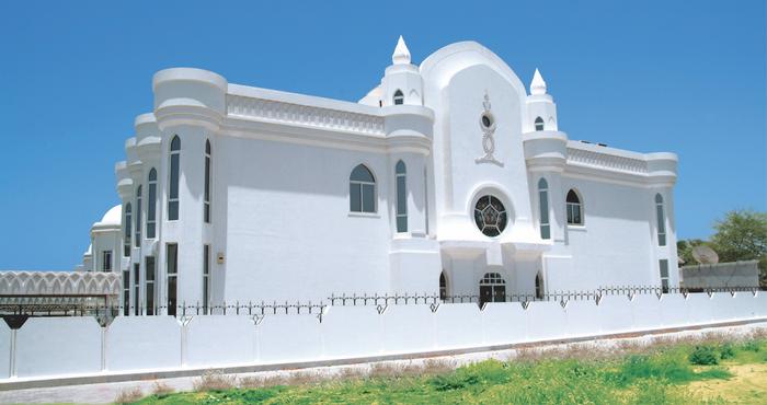 A modern Oman villa, but painted white and incorporating at least some characteristics of more traditional structures.