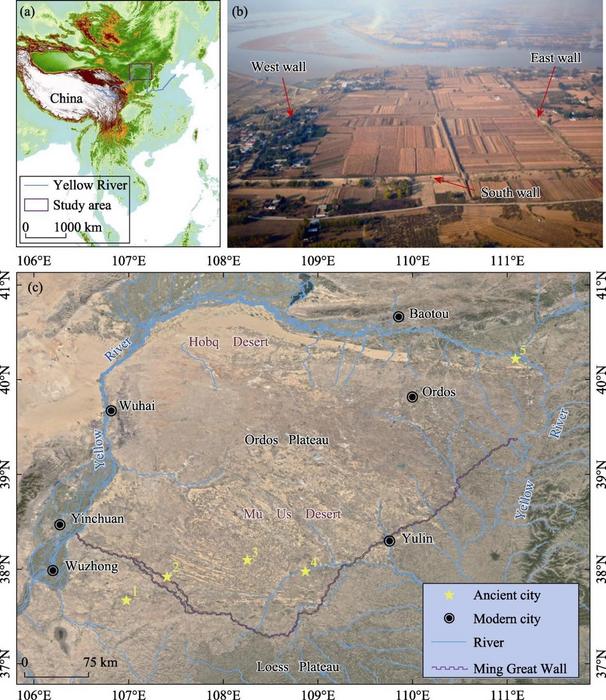 (A) LOCATION OF THE ORDOS PLATEAU; (B) AERIAL PHOTOGRAPH FROM THE SOUTHERN SIDE OF SHI-ER-LIAN-CHENG (AN ANCIENT CITY WHICH HAS BEEN OCCUPIED FOR THE LONGEST TIME IN THE ORDOS PLATEAU); (C) DE- TAILED SATELLITE IMAGE OF THE ORDOS PLATEAU (GOOGLE EARTH, 2010). THE PURPLE LINE MARKS THE LOCATION OF THE MING GREAT WALL, AND THE YELLOW STARS REPRESENT THE FOLLOWING ANCIENT CITIES: 1, TIEZHUQUAN; 2, ZHANGJIACHANG; 3, BAYANHURIHU; 4, TONGWAN CITY; 5, SHI-ER-LIAN-CHENG.