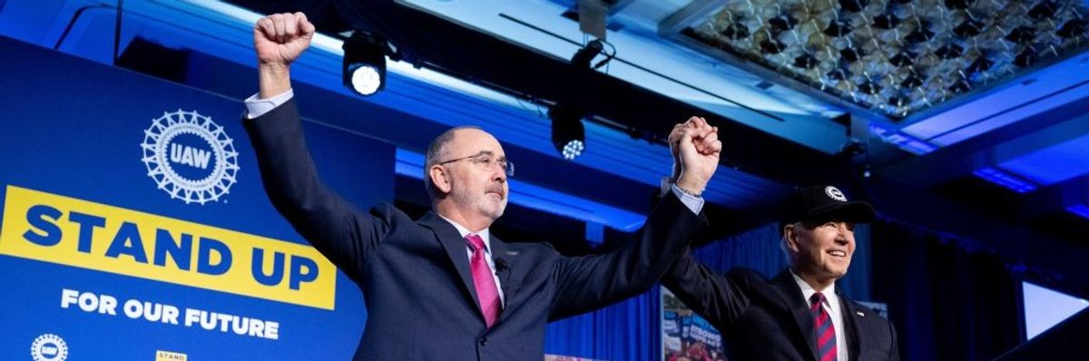 Confirming the endorsement in a Wednesday speech, UAW president Shawn Fain stressed the differences between Trump and Biden—who in September became the first sitting president to stand with strikers on a picket line when he joined UAW members during their battle with the Big Three automakers, just months after working with Congress to thwart a threatened rail strike.