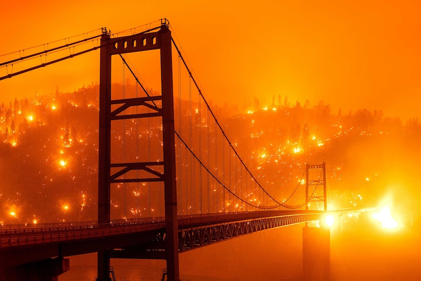 Embers light up a hillside behind the Bidwell Bar Bridge in Oroville, California during the 2020 fires.