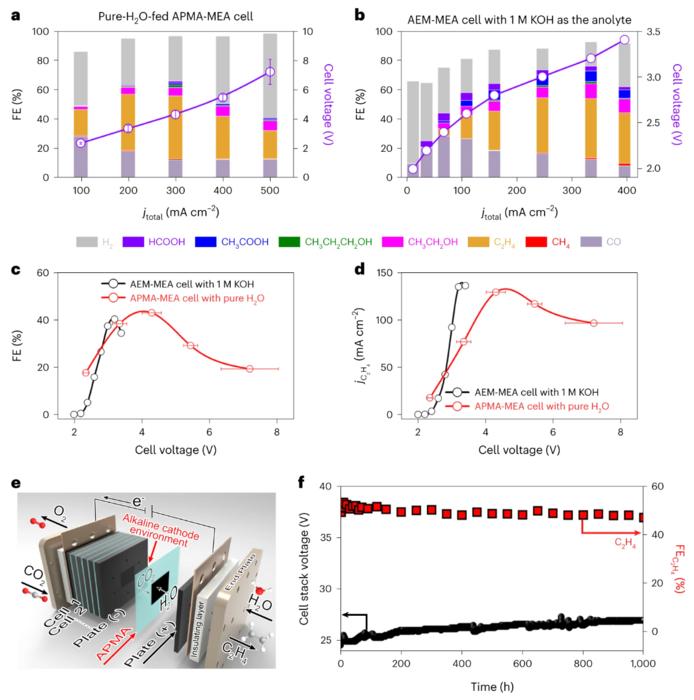 Prof. Lau’s innovation is to dispense with the alkali-metal electrolyte and use pure water as a metal-free anolyte to prevent carbonate formation and salt deposition. The research team denotes their design the APMA system, where A stands for anion-exchange membrane (AEM), P represents the proton-exchange membrane (PEM), and MA indicates the resulting membrane assembly.