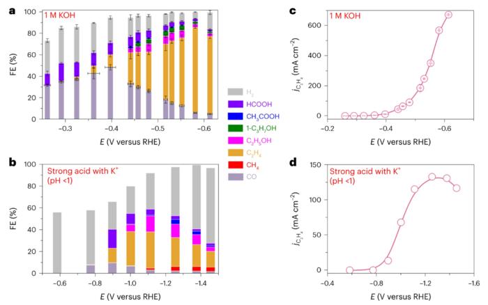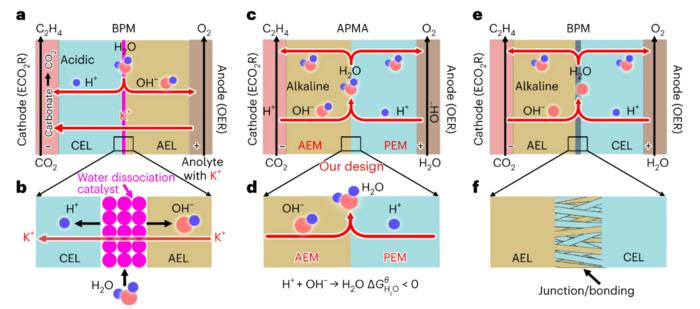 Further tests showed that the formation of carbonates and salts was suppressed, while there was no loss of CO2 or electrolyte. This is crucial, as previous cells using bipolar membranes instead of APMA suffered from electrolyte loss due to the diffusion of alkali-metal ions from the anolyte. The formation of hydrogen in competition with ethylene, another problem affecting earlier systems that used acidic cathode environments, was also minimised.