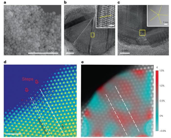 a, A scanning electron microscopy image of SS-Cu. b,c, Typical HRTEM images of SS-Cu, revealing abundant stacking faults (b) and grain boundaries (c) with inset atomic-resolution HAADF-STEM images from the area highlighted with a yellow rectangle. The yellow lines in the insets highlight stacking faults and five-fold twin boundaries. d, An atomic-resolution HAADF-STEM image showing stepped faces induced by a stacking fault and a twin boundary, both along {111} planes (dashed white lines). e, GPA strain (ε) mapping on d, showing tensile strain near the surface exits of the stacking fault and the twin boundary, using the lattice far from these defects as a reference (zero strain). The measured strain is perpendicular to the {111} plane along which the stacking fault and twin boundary align.