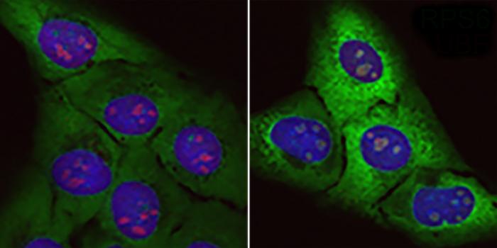 ACCUMULATION OF "JUNK PROTEINS": NORMAL CELLS (LEFT) AND CELLS SUBJECTED TO THE EFFECT OF THE TOXIC ARGININE-RICH PROTEIN (RIGHT). IN THE LATTER, RIBOSOMAL PROTEINS (GREEN FLUORESCENT) AND THE SIZE OF NUCLEOLI (RED) ARE INCREASED.