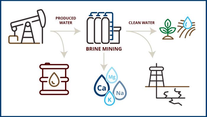 Once produced water is separated from oil, the intended process involves a brine mining process to recover critical minerals and other elements before the water is cleaned for specific agriculture operations or for use in fracturing operations to recover more oil.