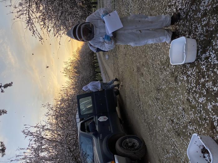 Washington State University researchers and students collect samples and perform honey bee colony health assessments in orchards near Modesto, CA. Every year more than 2 million honey bee hives from across the country are moved to California to pollinate almond trees in February. To manage bee health and the logistics of the move, many commercial beekeepers are starting to use indoor cold storage for their hives – a practice that researchers have found might also help prevent colony collapses from longer, warm autumns due to climate change.