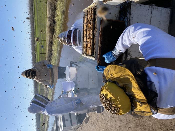 WASHINGTON STATE UNIVERSITY RESEARCHERS AND STUDENTS COLLECT SAMPLES AND PERFORM HONEY BEE COLONY HEALTH ASSESSMENTS IN ORCHARDS NEAR MODESTO, CA. EVERY YEAR MORE THAN 2 MILLION HONEY BEE HIVES FROM ACROSS THE COUNTRY ARE MOVED TO CALIFORNIA TO POLLINATE ALMOND TREES IN FEBRUARY. TO MANAGE BEE HEALTH AND THE LOGISTICS OF THE MOVE, MANY COMMERCIAL BEEKEEPERS ARE STARTING TO USE INDOOR COLD STORAGE FOR THEIR HIVES – A PRACTICE THAT RESEARCHERS HAVE FOUND MIGHT ALSO HELP PREVENT COLONY COLLAPSES FROM LONGER, WARM AUTUMNS DUE TO CLIMATE CHANGE.