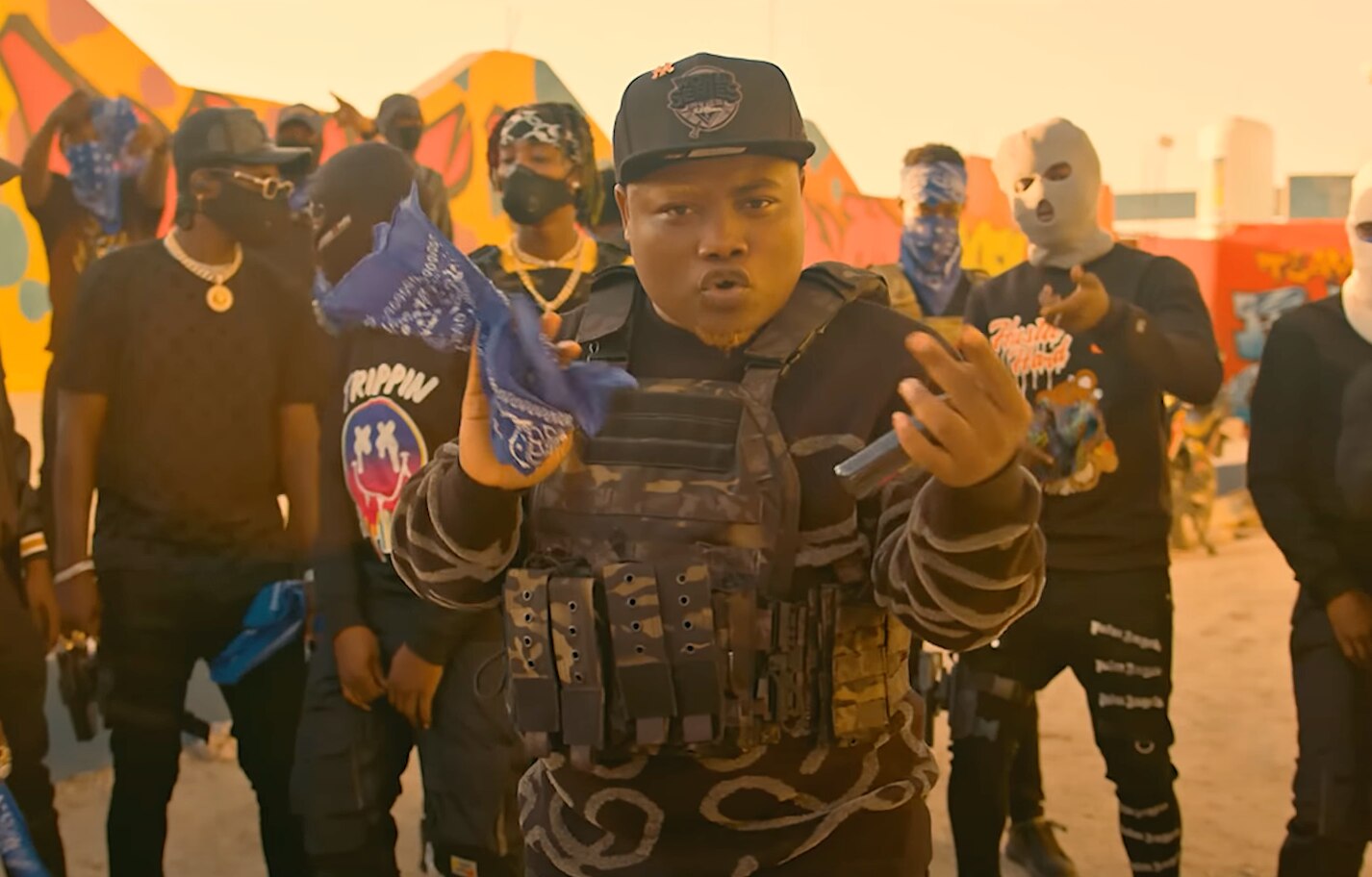 Weapons and wealth on display in a music video featuring Johnson "Izo" André on YouTube.(Supplied: YouTube)