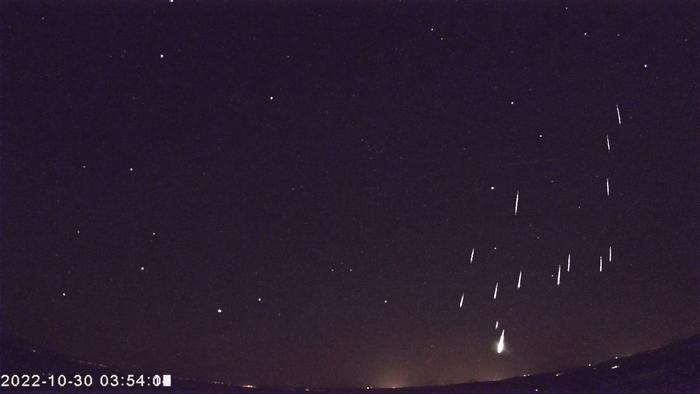 THIS METEOROID BROKE UP BY THERMAL STRESSES JUST BEFORE ENTERING EARTH'S ATMOSPHERE, CREATING A CLUSTER OF METEORS OVER NORWAY ON OCTOBER 30, 2022, RECORDED BY ALLSKY7 STATION AMS119 OPERATED BY GAUSTABANEN AND STEINAR MIDTSKOGEN OF THE NORWAY METEOR NETWORK.