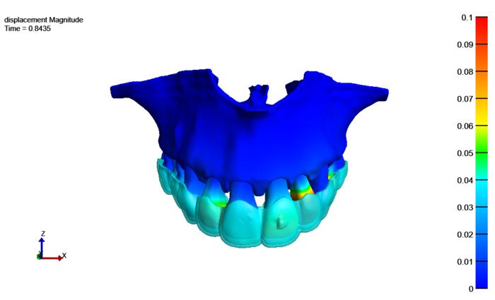 A DIGITAL TWIN OF A PATIENT'S JAW CREATED THROUGH THE INTEGRATION OF AI SOLUTIONS AND COMPUTATIONAL MODELING, ENABLING PRECISE SIMULATION OF ANTICIPATED TEETH MOVEMENTS UNDER SPECIFIC CONDITIONS. THE COLOR MAP VISUALLY REPRESENTS THE EXTENT AND DIRECTION OF TEETH MOVEMENT, WITH WARMER COLORS INDICATING HIGHER TEETH MOVEMENTS.