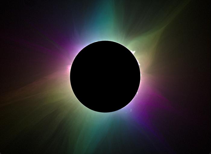 The SwRI-led Citizen Continental-America Telescopic Eclipse (CATE) 2024 project evaluated special cameras to measure the polarization of coronal light during the April 2023 total solar eclipse in Exmouth, Western Australia. In this image, the colors indicate the polarization or orientation of the light. The white features, called prominences, have no polarization.