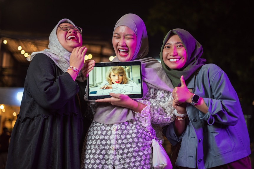 Ernas Tiara (left) is joining an army of Swifties who are flying into Singapore for Taylor Swift's shows.(ABC News: Mitch Woolnough)
